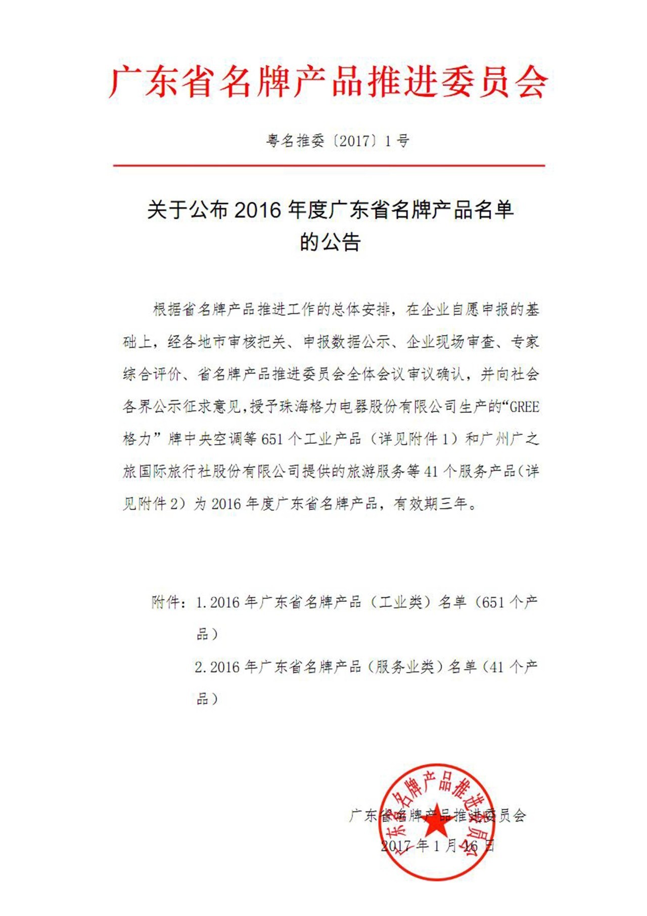 根據(jù)省名牌產(chǎn)品推進工作的總體安排,在企業(yè)自愿申報的基礎(chǔ)上,經(jīng)各地市審核把關(guān)、申報數(shù)據(jù)公示、企業(yè)現(xiàn)場審查、專家綜合評價、省名牌產(chǎn)品推進委員會全體會議審議確認,并向社會各界公示征求意見,授予珠海格力電器股份有限公司生產(chǎn)的“GREE格力”牌中央空調(diào)等651個工業(yè)產(chǎn)品(詳見附件1)和廣州廣之旅國際旅行社股份有限公司提供的旅游服務(wù)等41個服務(wù)產(chǎn)品(詳見附件2)為2016年度廣東省名牌產(chǎn)品,有效期三年。