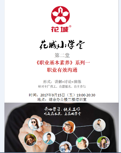 “花城小學(xué)堂”是廣州珠江電纜集團成立的學(xué)習(xí)興趣小組,它的宗旨在于為珠江電纜的員工提供一個學(xué)習(xí)和交流的平臺,最終達到打造珠江電纜學(xué)習(xí)型組織的目的,它的內(nèi)容包括與工作有關(guān)的財務(wù)、銷售、生產(chǎn)、行政、品質(zhì)等方面的知識講解;也有禮儀禮貌、溝通能力、表達能力、寫作能力提升的培訓(xùn);還有個人情感、員工勵志、生活百科的交流;其中還加入一些笑話、幽默、歌聲等娛樂節(jié)目。題材不限、內(nèi)容不拘、多姿多彩,開心、健康、正能量是學(xué)堂的主旋律。
